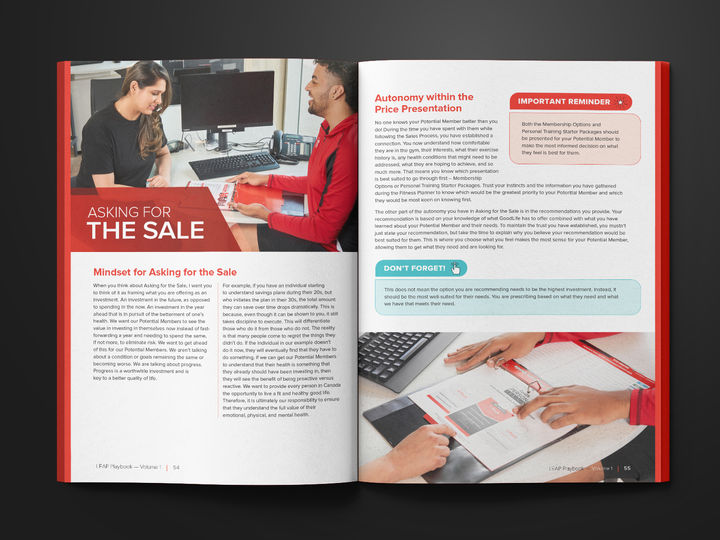 The goal was to create a clear, easy-to-use guide that in-Club Associates could reference and annotate while building their sales skills. The updated materials were designed to support onboarding, improve confidence, and provide consistency across locations.